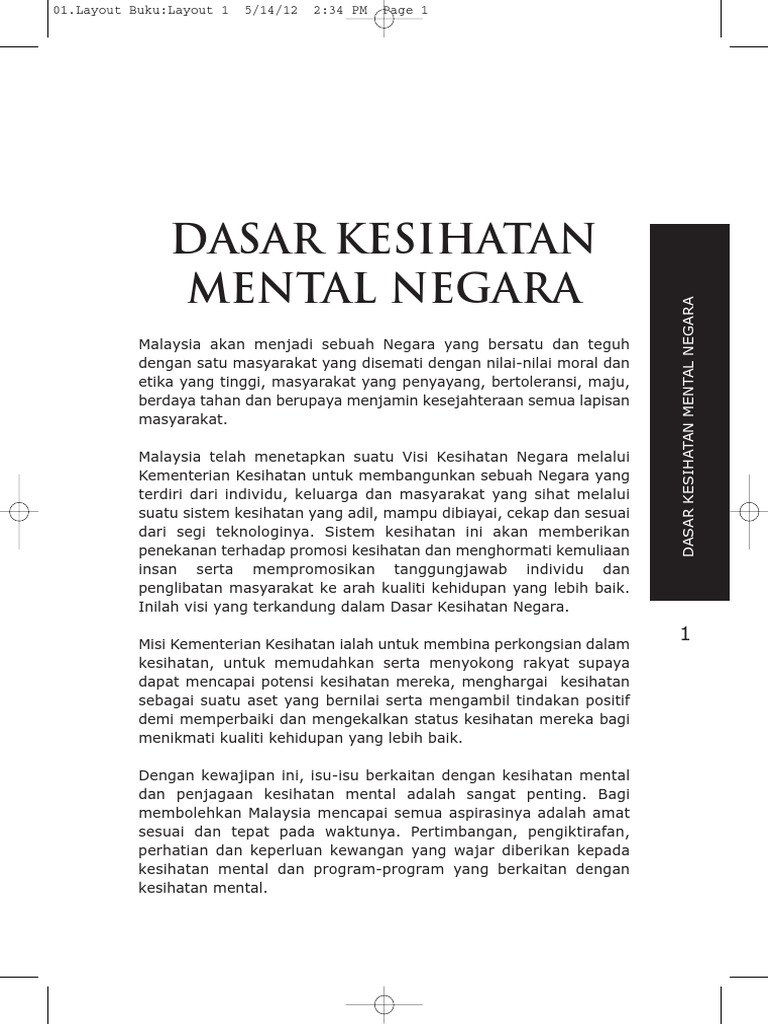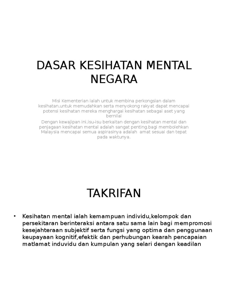 1 D A S A R K E S I H A T A N M E N T A L N E G A R A DASAR KESIHATAN MENTAL NEGARA Malaysia akan menjadi sebuah Negara yang bersatu dan teguh. Kementerian Kesihatan Malaysia MOH bertanggungjawab untuk membantu seseorang individu untuk mencapai dan mengekalkan. Baca versi flipbook dari Dasar Kesihatan Mental Negara 1.